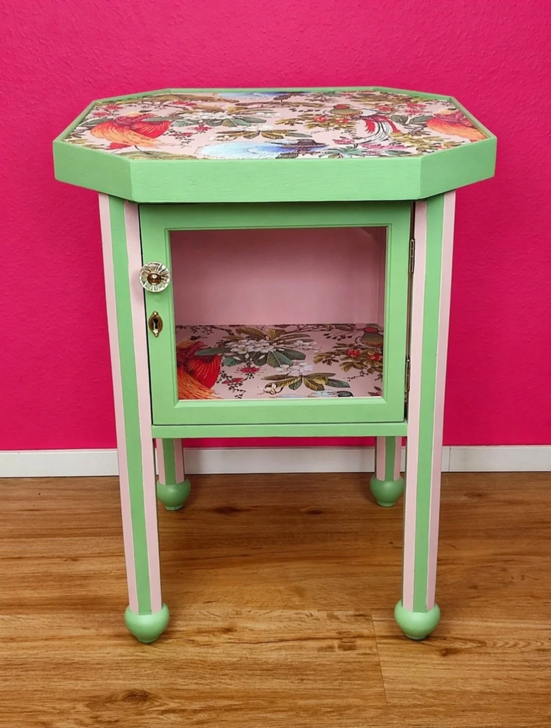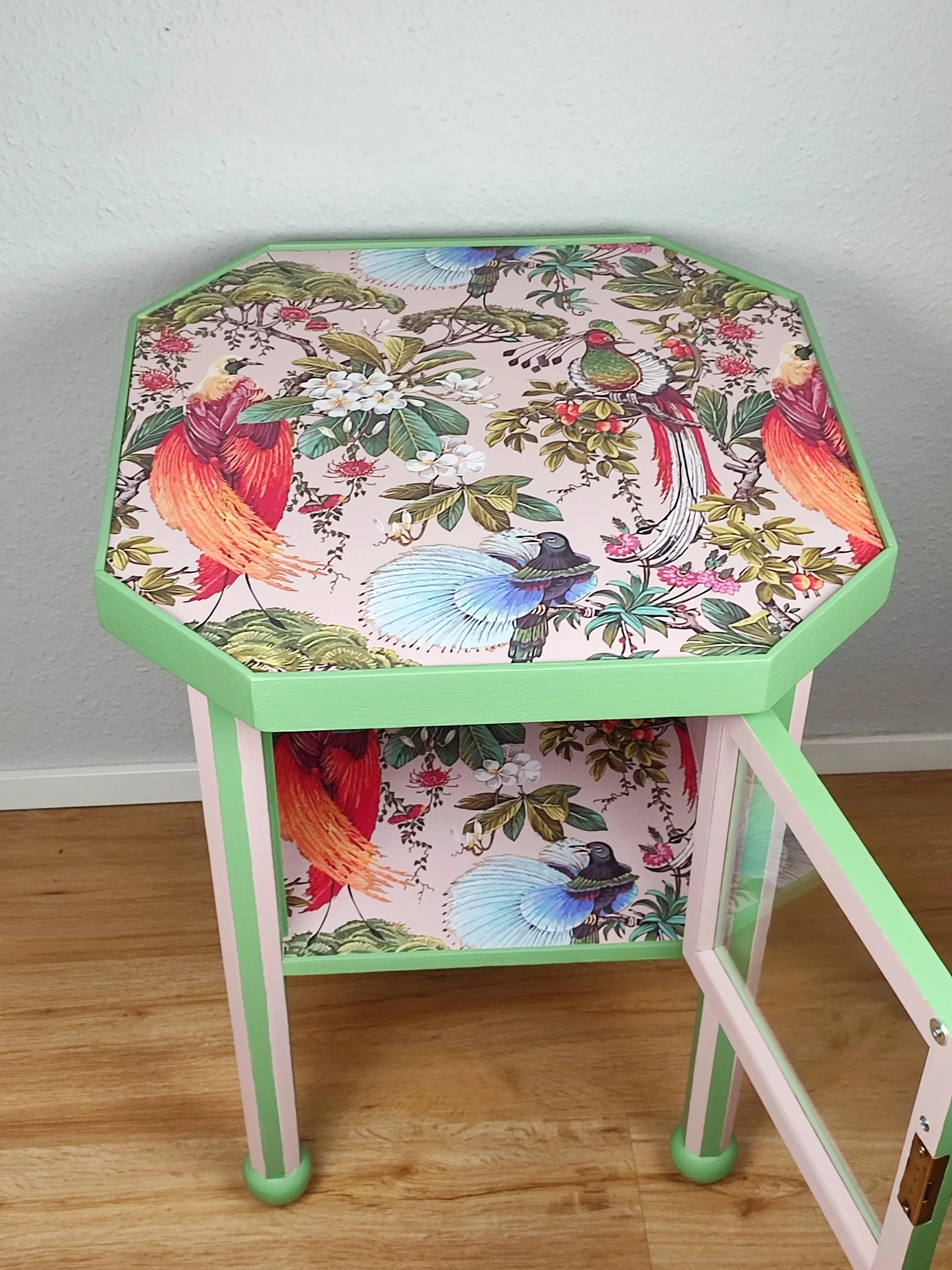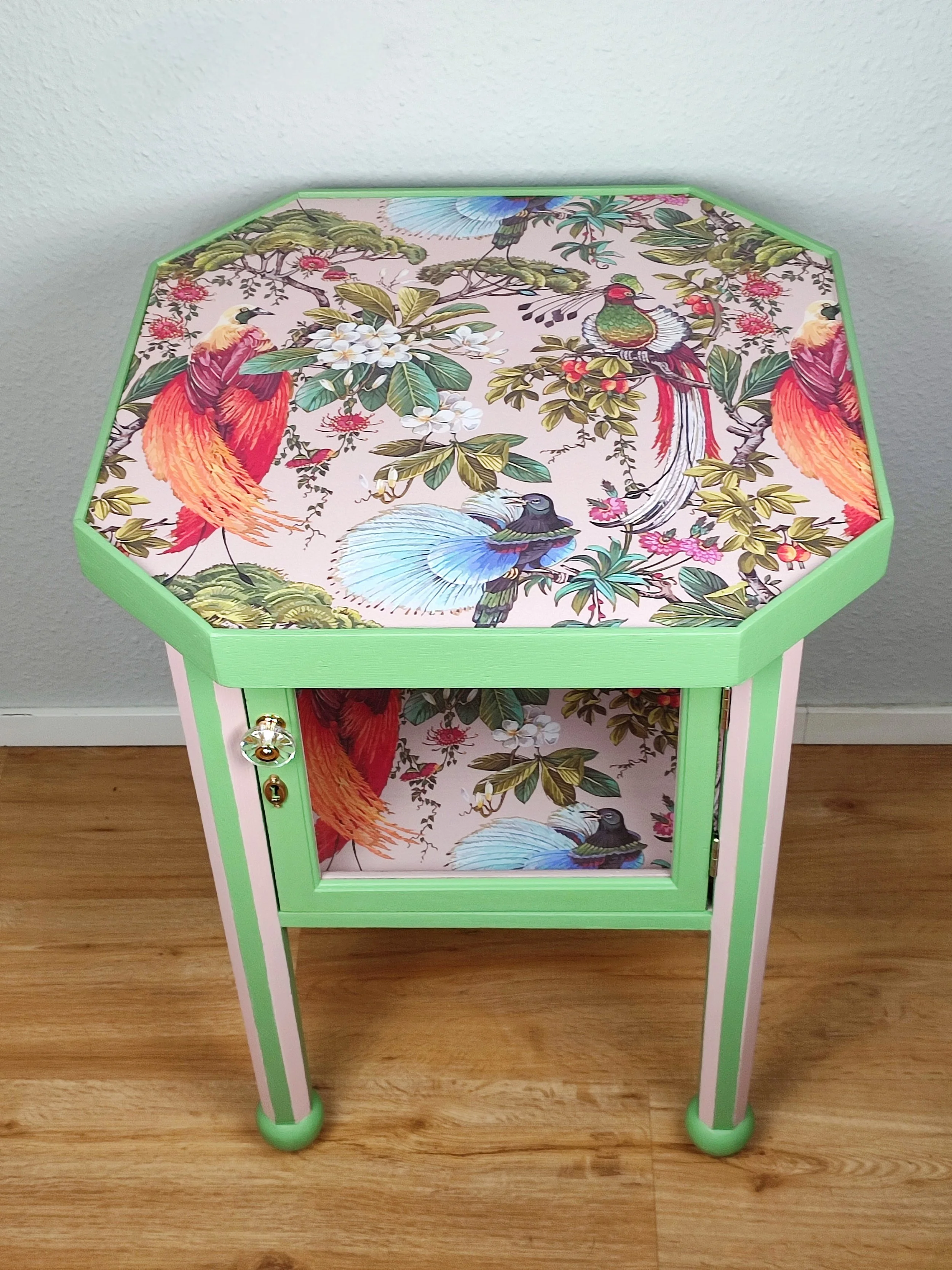 Es wurde vollständig zerlegt, von Grund auf aufgearbeitet und mit viel Liebe zum Detail neu gestaltet. Die Oberfläche wurde mit einer Holzplatte aufgebaut und hochwertig veredelt. Auch technisch wurde das Schränkchen überarbeitet - mit neuen Scharnieren und einem stilvollen Türknauf. Die Kombination aus sanften Rosa und frischem Grünton verleiht dem Stück eine moderne Leichtigkeit, während das außergewöhnliche Dekor mit exotischen Vögeln und floralen Elementen einen Hauch von Fernweh und Eleganz mitbringt. Ob als stilvolles Schränkchen im Wohnbereich oder als besonderes Highlight im Raum - dieses Unikat bringt Farbe, Charakter und echtes Handwerk in dein Zuhause.