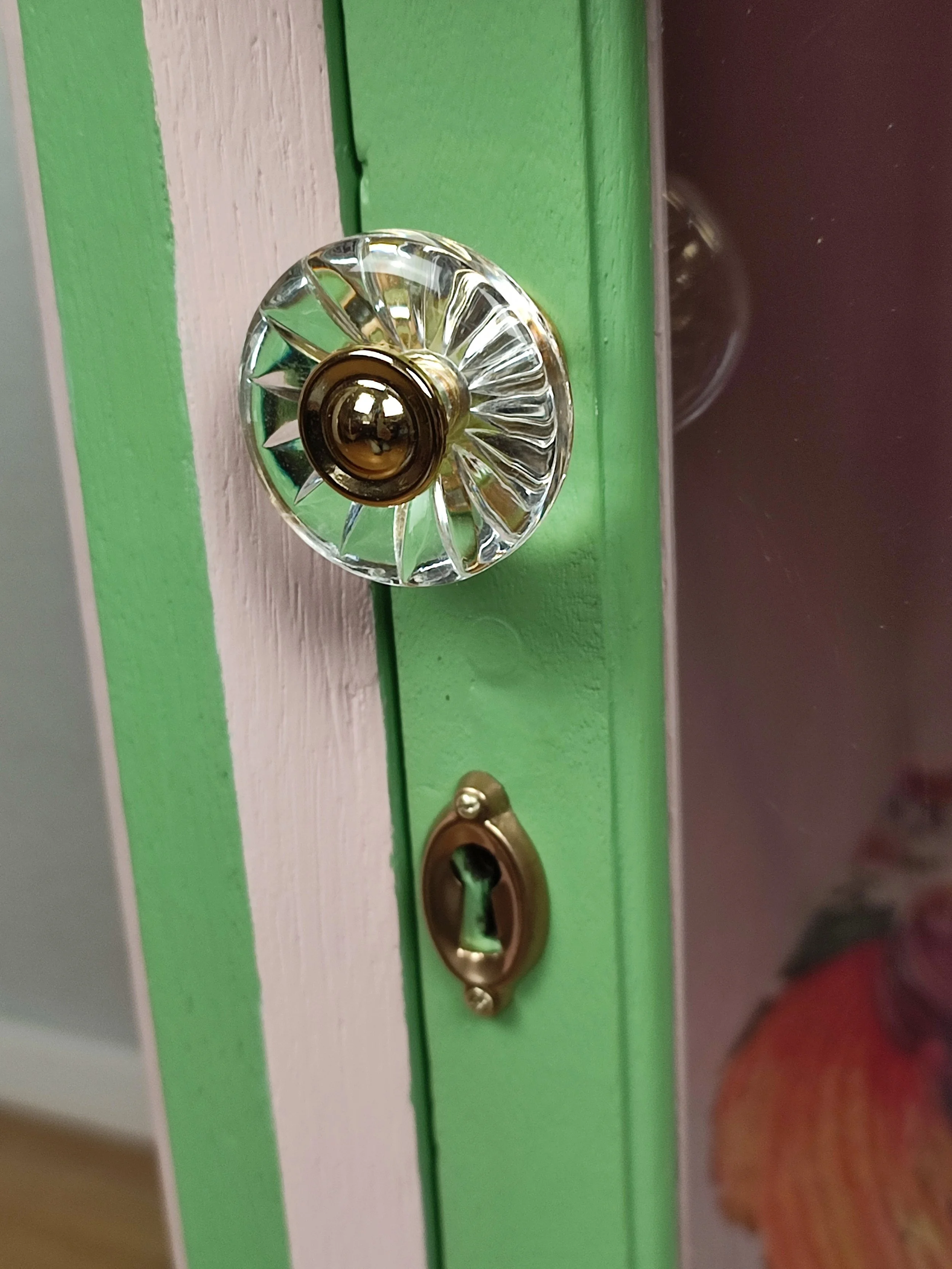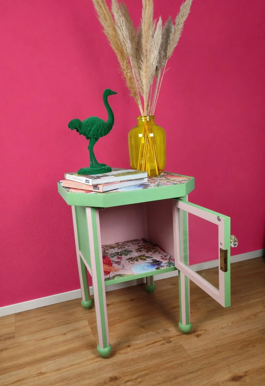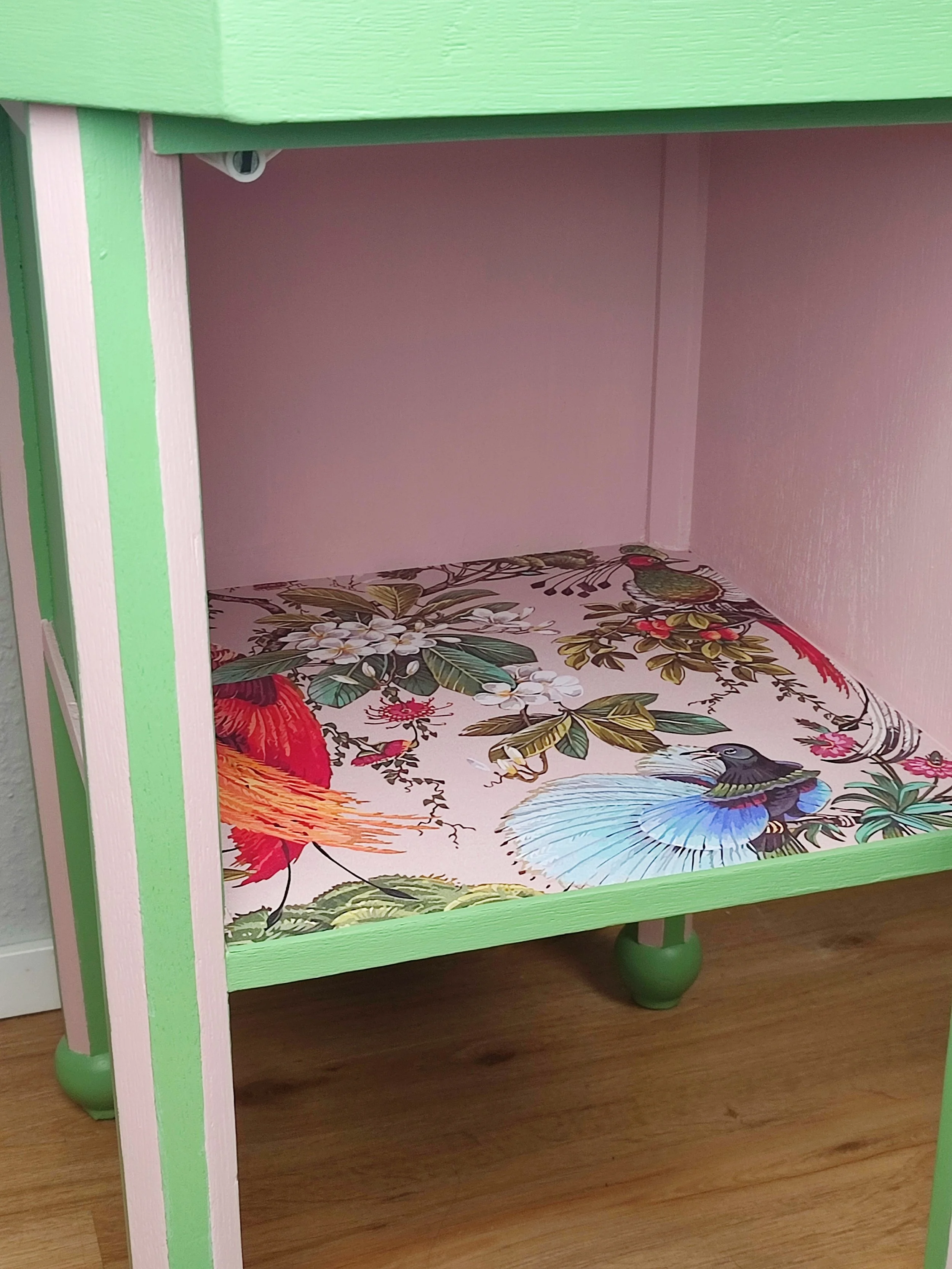 Es wurde vollständig zerlegt, von Grund auf aufgearbeitet und mit viel Liebe zum Detail neu gestaltet. Die Oberfläche wurde mit einer Holzplatte aufgebaut und hochwertig veredelt. Auch technisch wurde das Schränkchen überarbeitet - mit neuen Scharnieren und einem stilvollen Türknauf. Die Kombination aus sanften Rosa und frischem Grünton verleiht dem Stück eine moderne Leichtigkeit, während das außergewöhnliche Dekor mit exotischen Vögeln und floralen Elementen einen Hauch von Fernweh und Eleganz mitbringt. Ob als stilvolles Schränkchen im Wohnbereich oder als besonderes Highlight im Raum - dieses Unikat bringt Farbe, Charakter und echtes Handwerk in dein Zuhause.
